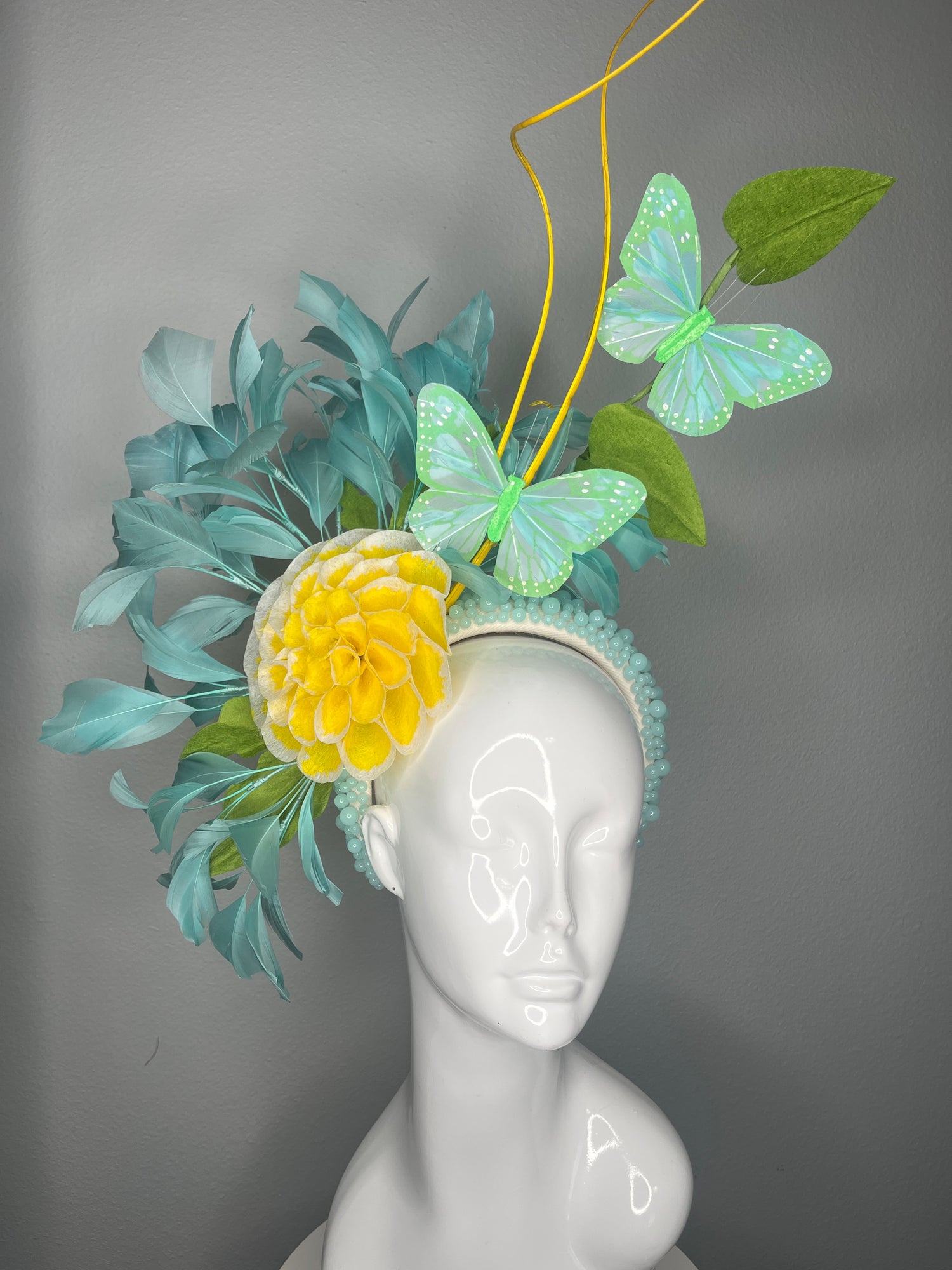 Step into springtime elegance with this enchanting fascinator featuring a radiant yellow bloom framed by aqua feather sprays. Delicate butterflies and vibrant green leaves add a touch of whimsy, while bold yellow quills create graceful movement. Finished on an aqua beaded headband, this headpiece is a show-stopping design perfect for the Kentucky Derby, garden parties, or any occasion where style takes flight.