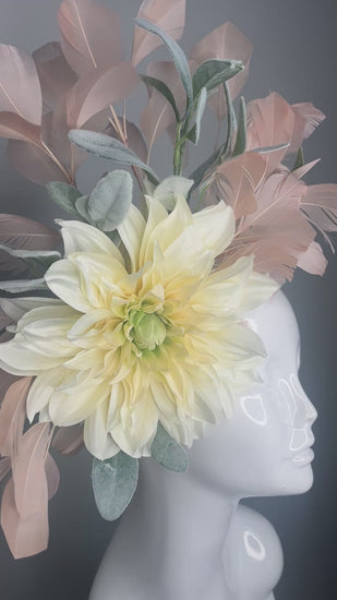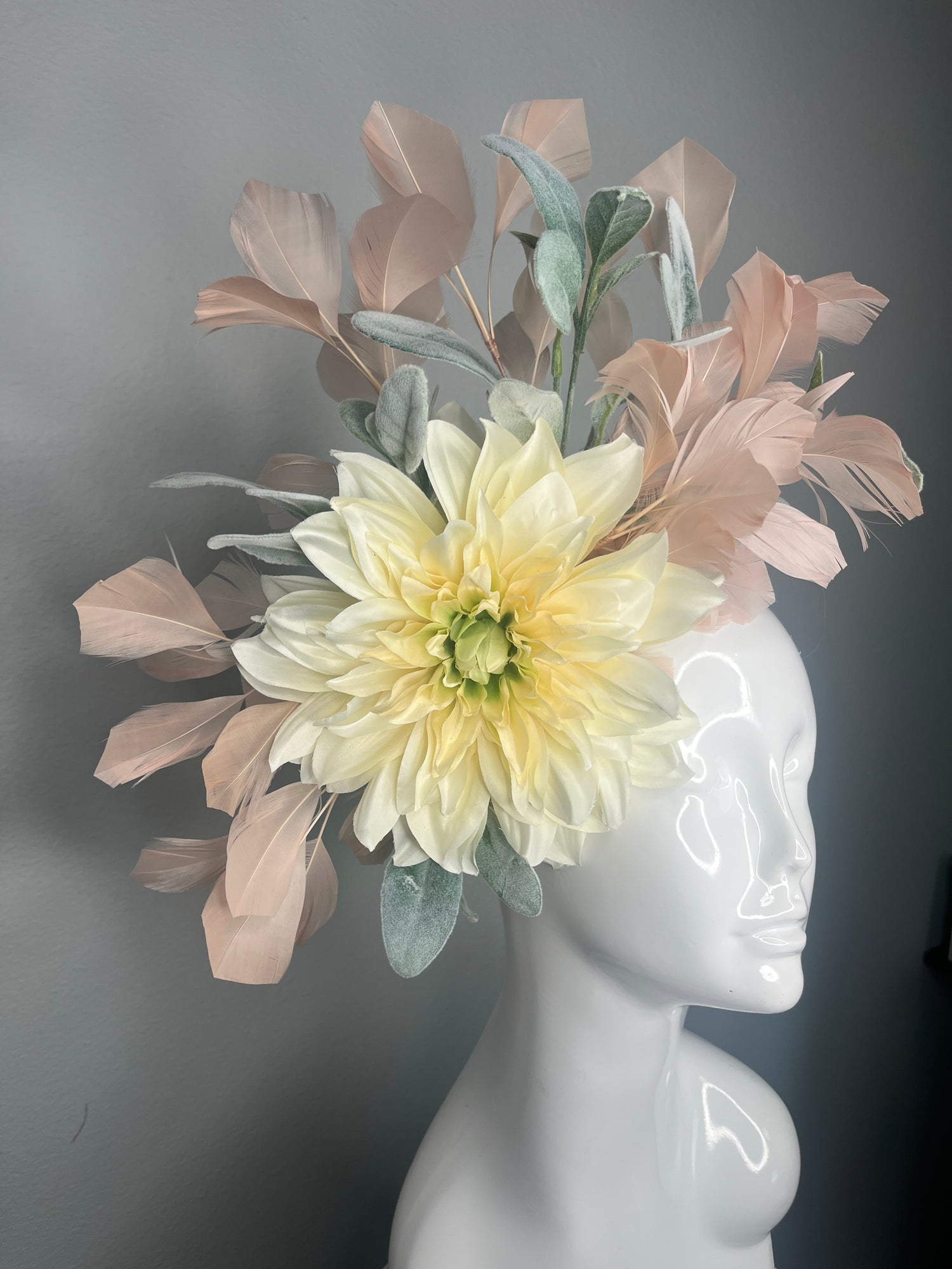 Blush Feather and Yellow Dahlia Fascinator Romantic Derby Fascinator Hat