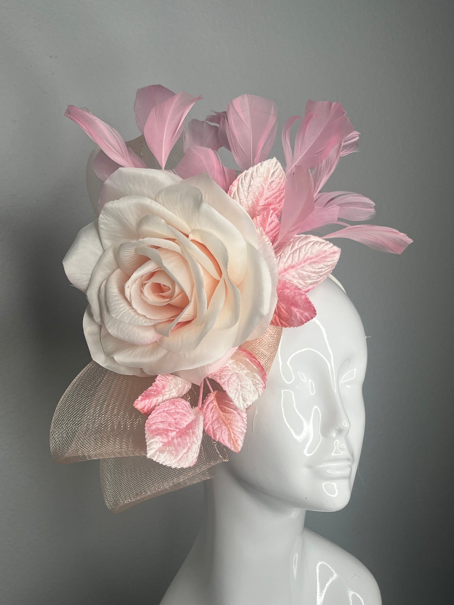 Blush Pink and Ivory Rose Fascinator with Feathers and Velvet Leaves Derby Hat Kentucky Oaks Headpiece