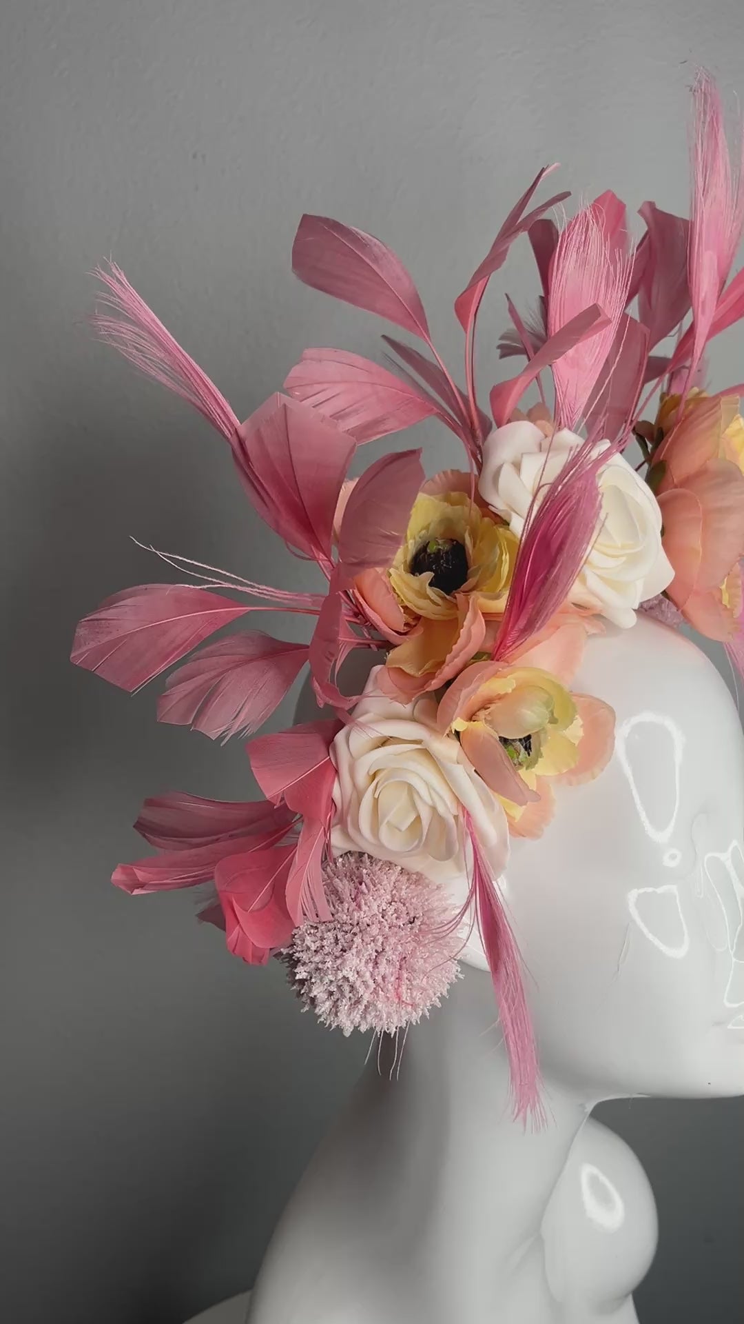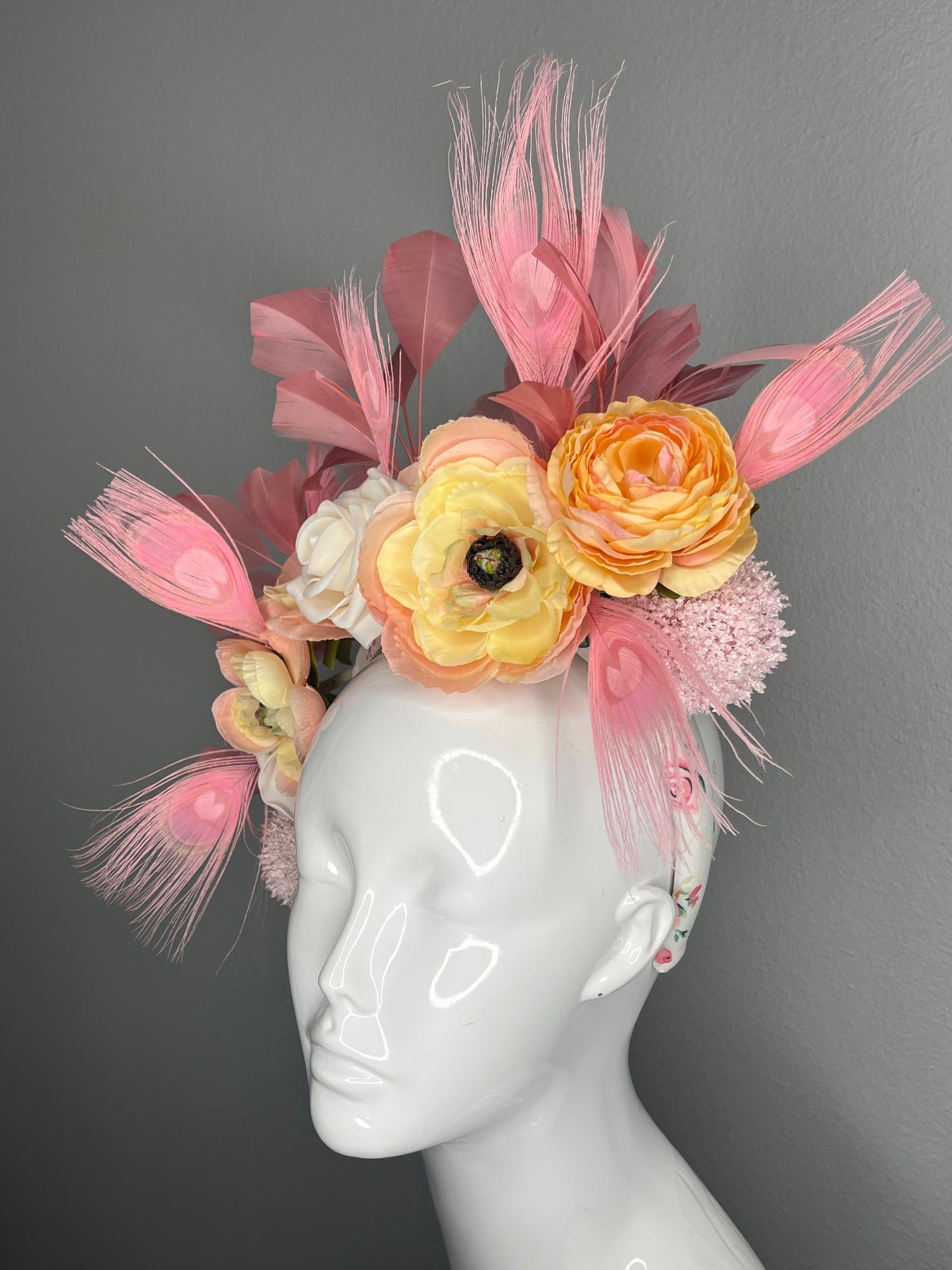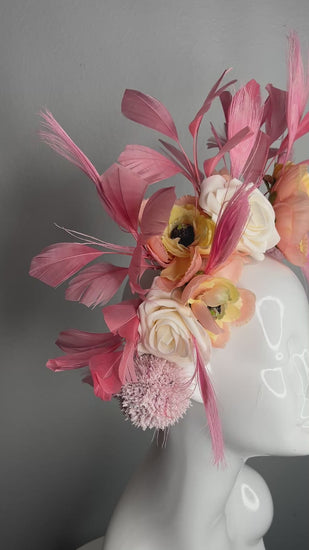 This romantic floral fascinator is a true statement piece, designed for elegant race days and unforgettable spring events. Featuring soft blush pink feathers, layered peach and buttercream florals, and delicate textural accents, this headpiece blends femininity with couture craftsmanship.