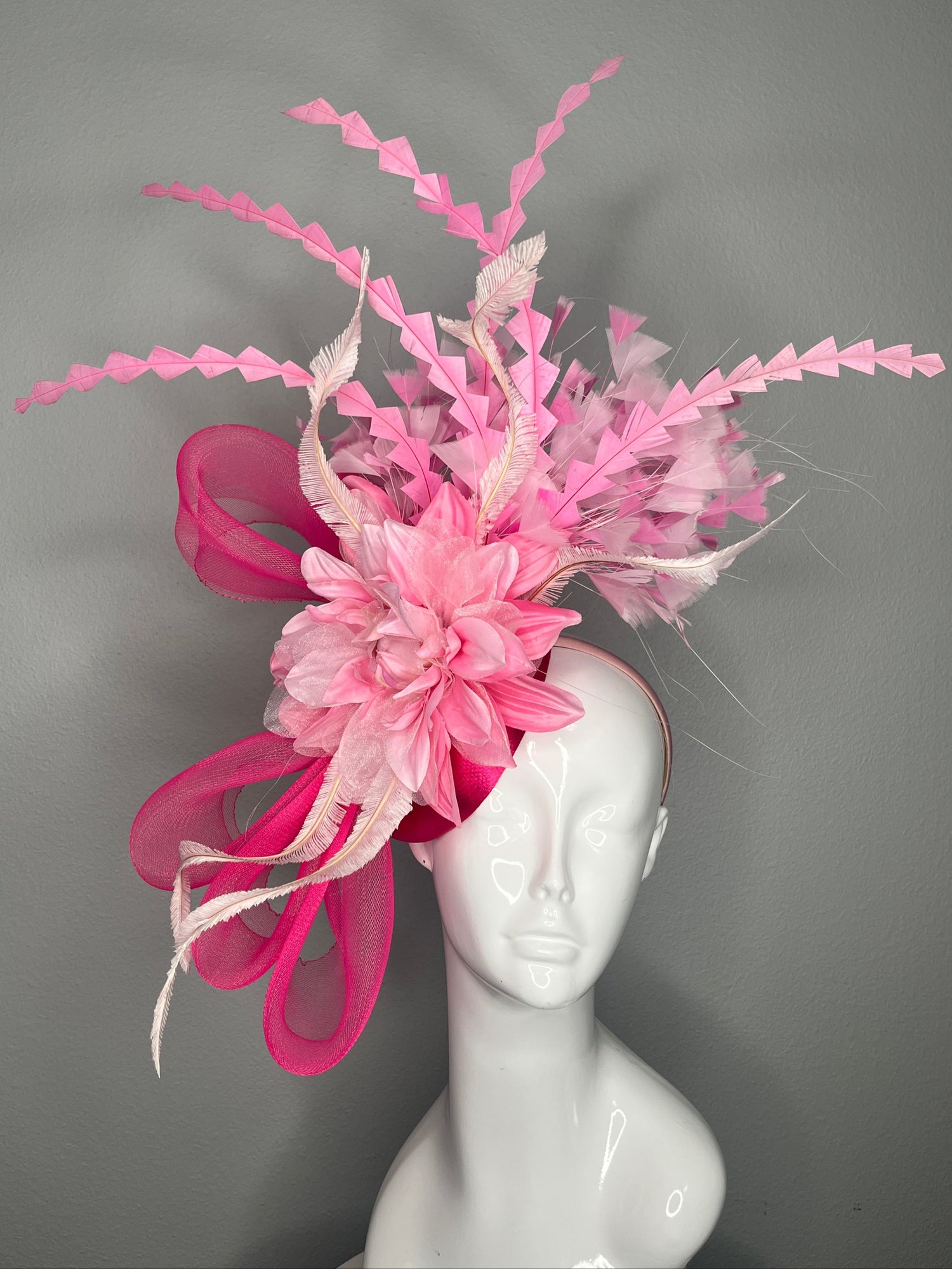 Bold Pink Statement Fascinator Hat with Floral and Feather Accents