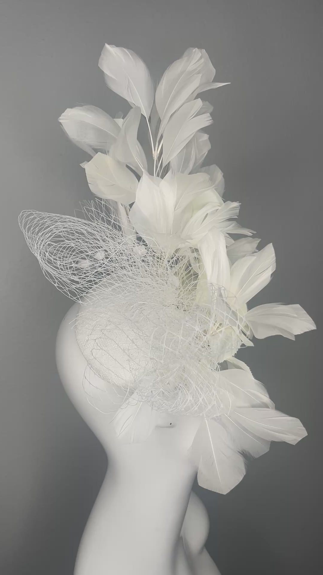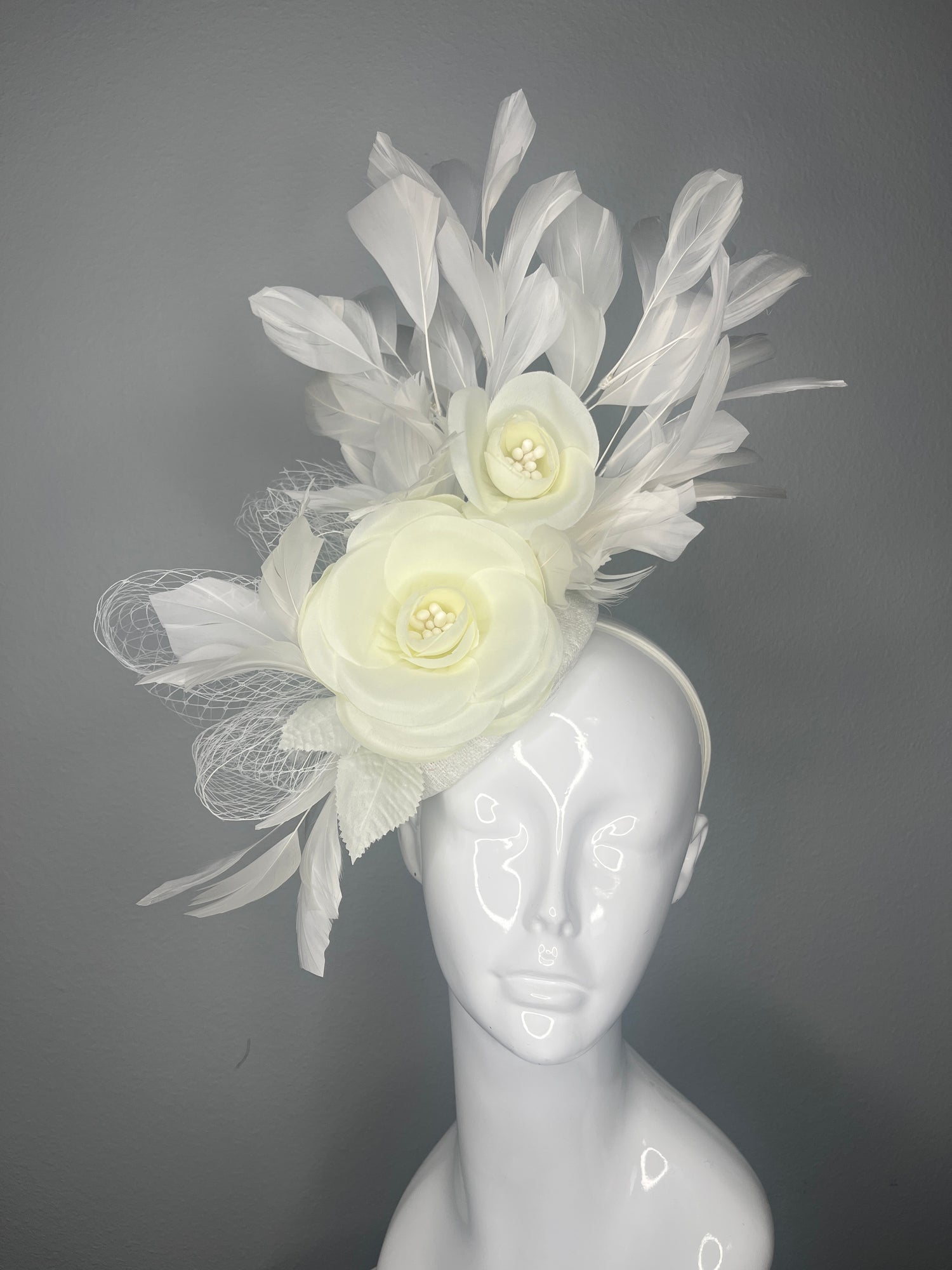 Step into sophistication with this dreamy white fascinator featuring soft ivory rose blooms, delicate feathers, and a touch of airy netting. Designed on a comfortable headband, this piece is the perfect balance of elegance and statement-making style.
