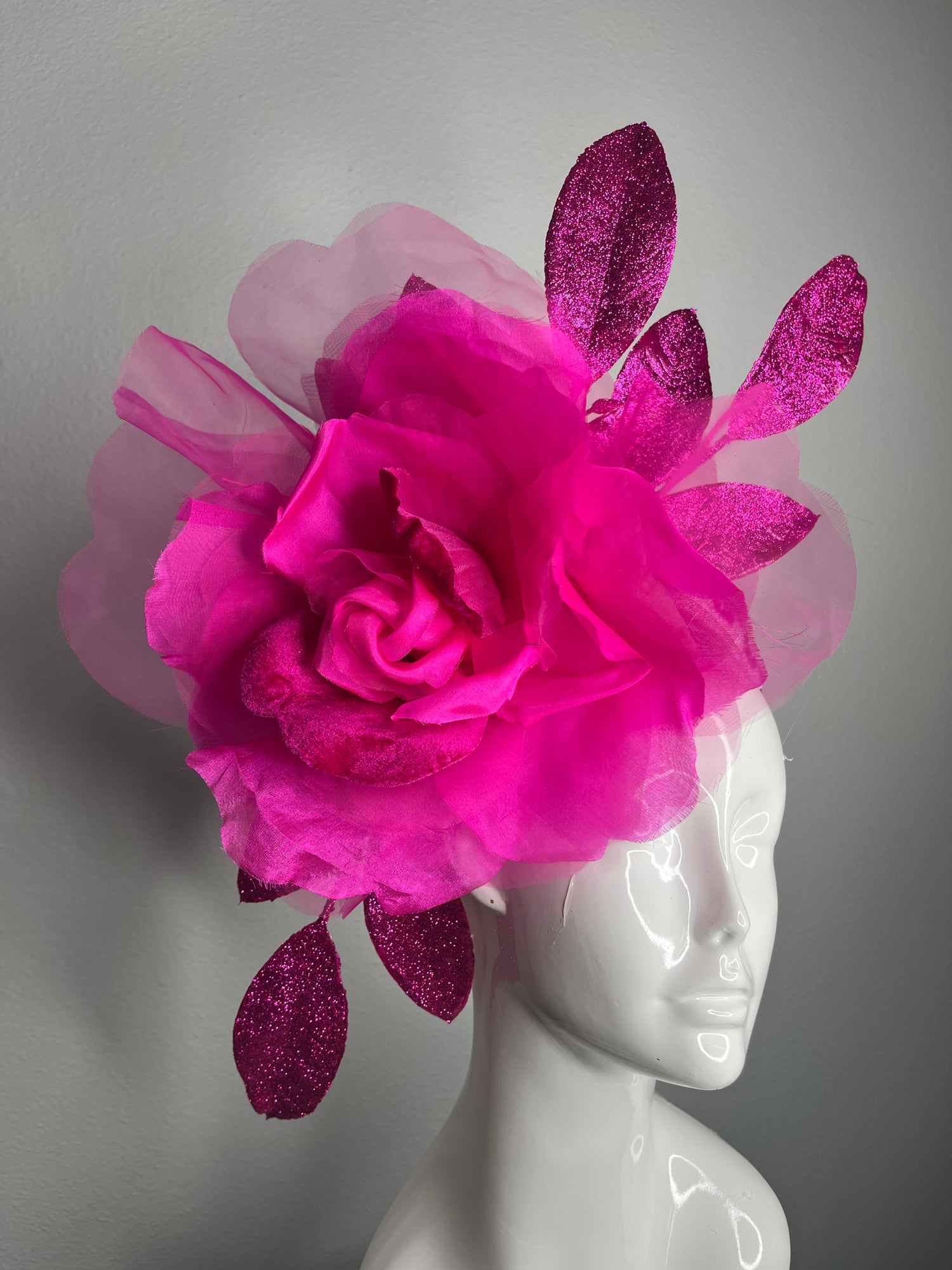 Step into the spotlight with this couture Hot Pink Glitter Leaf Fascinator, designed to make a bold, unforgettable impression. The centerpiece is an oversized, hand-sculpted hot pink flower crafted from layers of airy organza for soft volume and movement. Surrounding the bloom, vivid glittered leaves add dimension, sparkle, and striking contrast, creating a sculptural silhouette that photographs beautifully from every angle.
