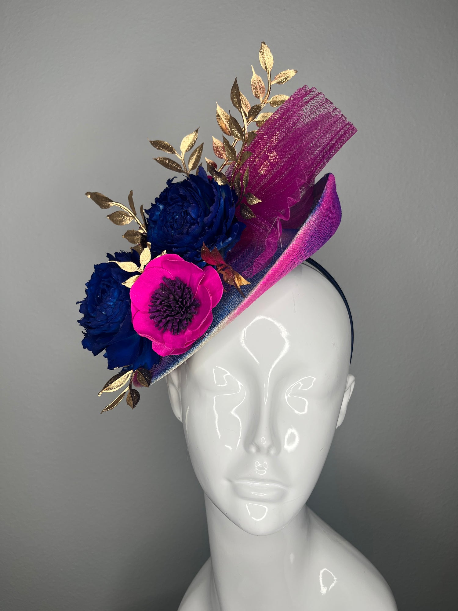 Turn heads with this bold hot pink and royal blue mini top hat fascinator, designed for women who want their headpiece to be the statement.