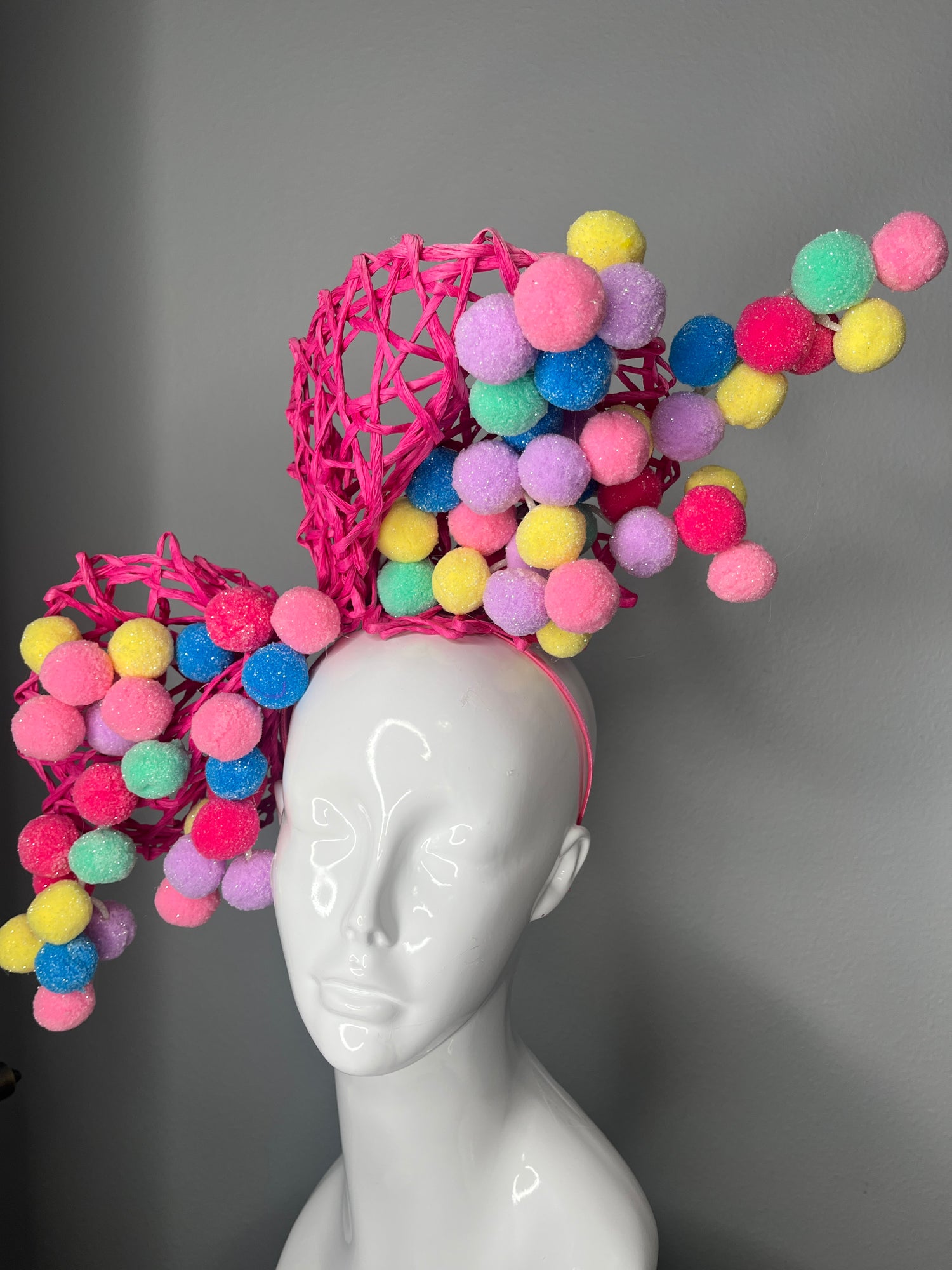 Bold, whimsical, and unapologetically fun, this sculptural couture fascinator is designed for the woman who treats fashion as art. Hand-woven hot pink elements create dramatic, architectural curves, accented with cascading pastel pom-pom details in soft pinks, yellows, blues, purples, and mint for a joyful pop of color and texture.