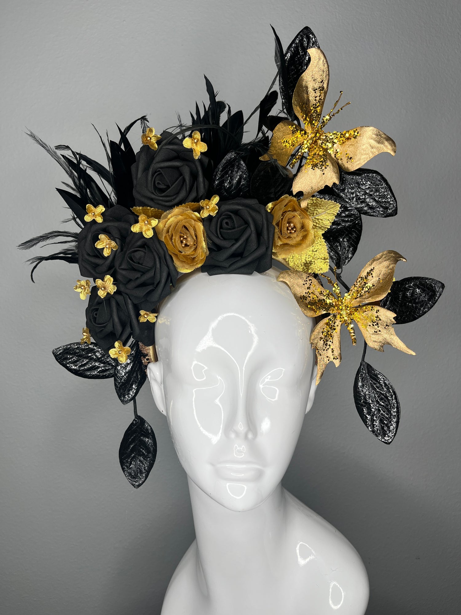An opulent showpiece of drama and allure, the Midnight Majesty Fascinator commands attention with its striking contrast of matte black roses and shimmering gold blooms. Handcrafted with sculpted roses, gilded lilies, and jet-black feathers, this bold headpiece embodies power, mystery, and modern elegance. Perfect for Derby Day, evening galas, or couture photo moments, it’s a statement of confidence and glamour — where dark sophistication meets golden radiance.