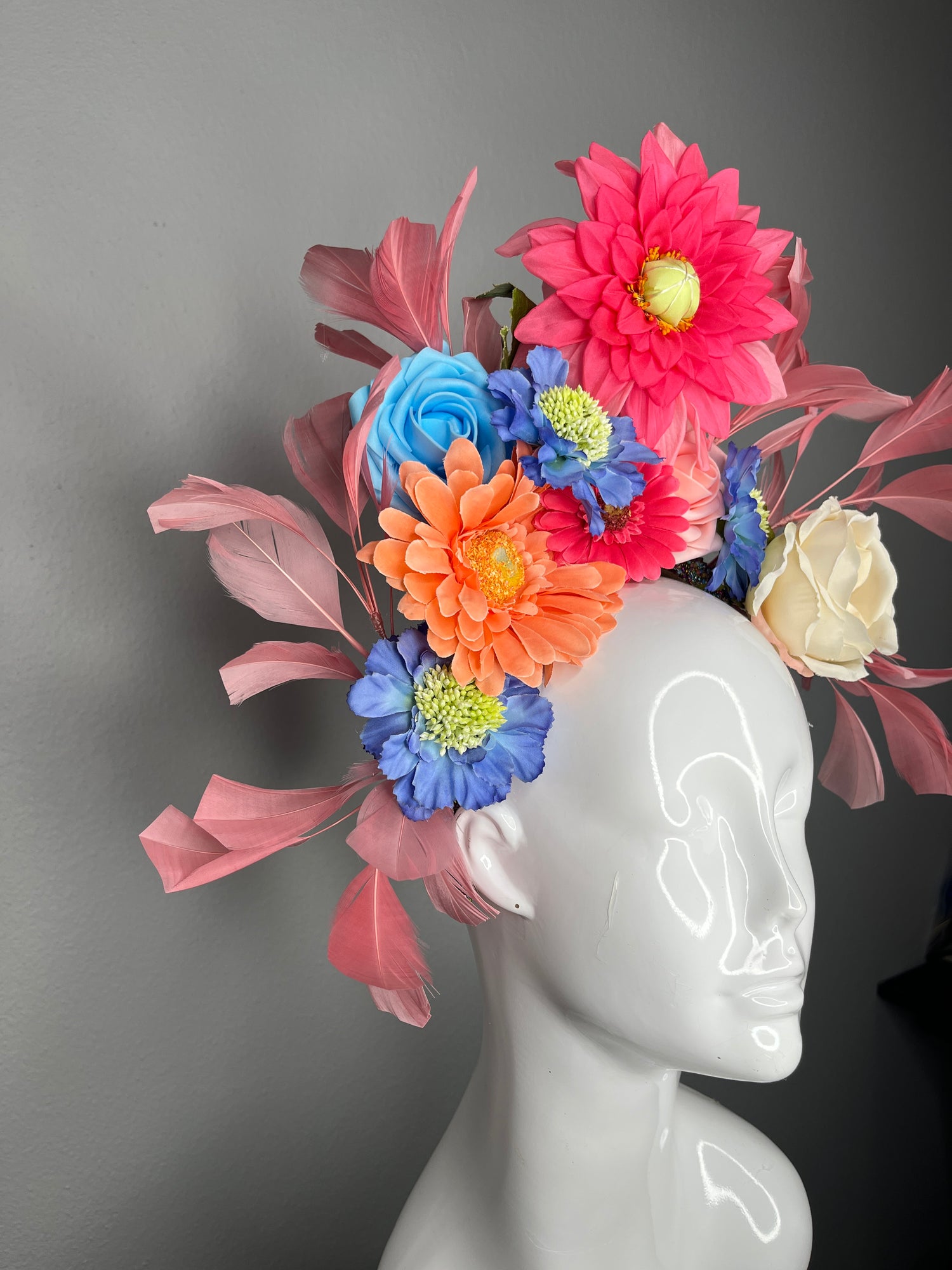 Multi-Color Garden Bloom Fascinator with Pink Feather Fans and Statement Florals