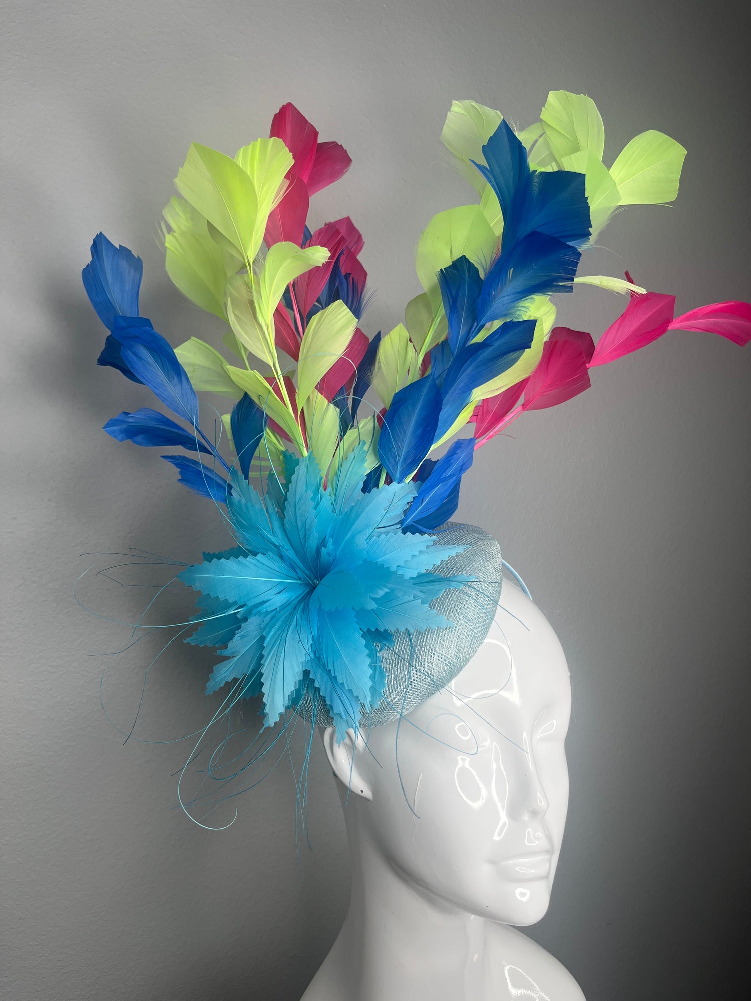 Bold, vibrant, and full of movement, this handcrafted fascinator features a soft blue sinamay base adorned with dramatic feather sprays in cobalt blue, lime green, and fuchsia. A sculpted blue floral accent anchors the design, adding texture and depth while keeping the look cohesive.