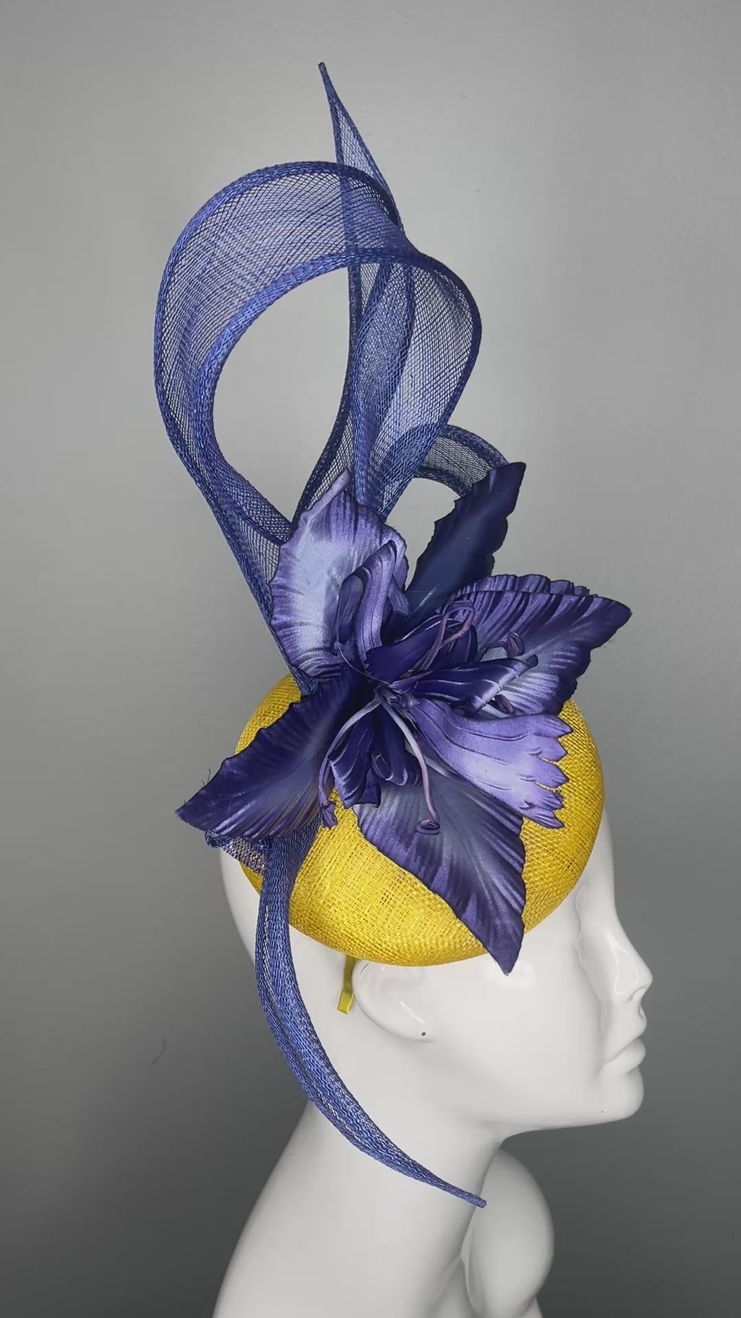 Turn heads at the Derby, weddings, or garden parties with this striking navy and yellow fascinator. A golden sinamay base is crowned with a dramatic burst of sculpted navy loops and hand-cut floral accents, creating an elegant play of color and movement. Lightweight and comfortable on a satin headband, this one-of-a-kind piece is perfect for making a bold yet sophisticated statement at any special occasion.