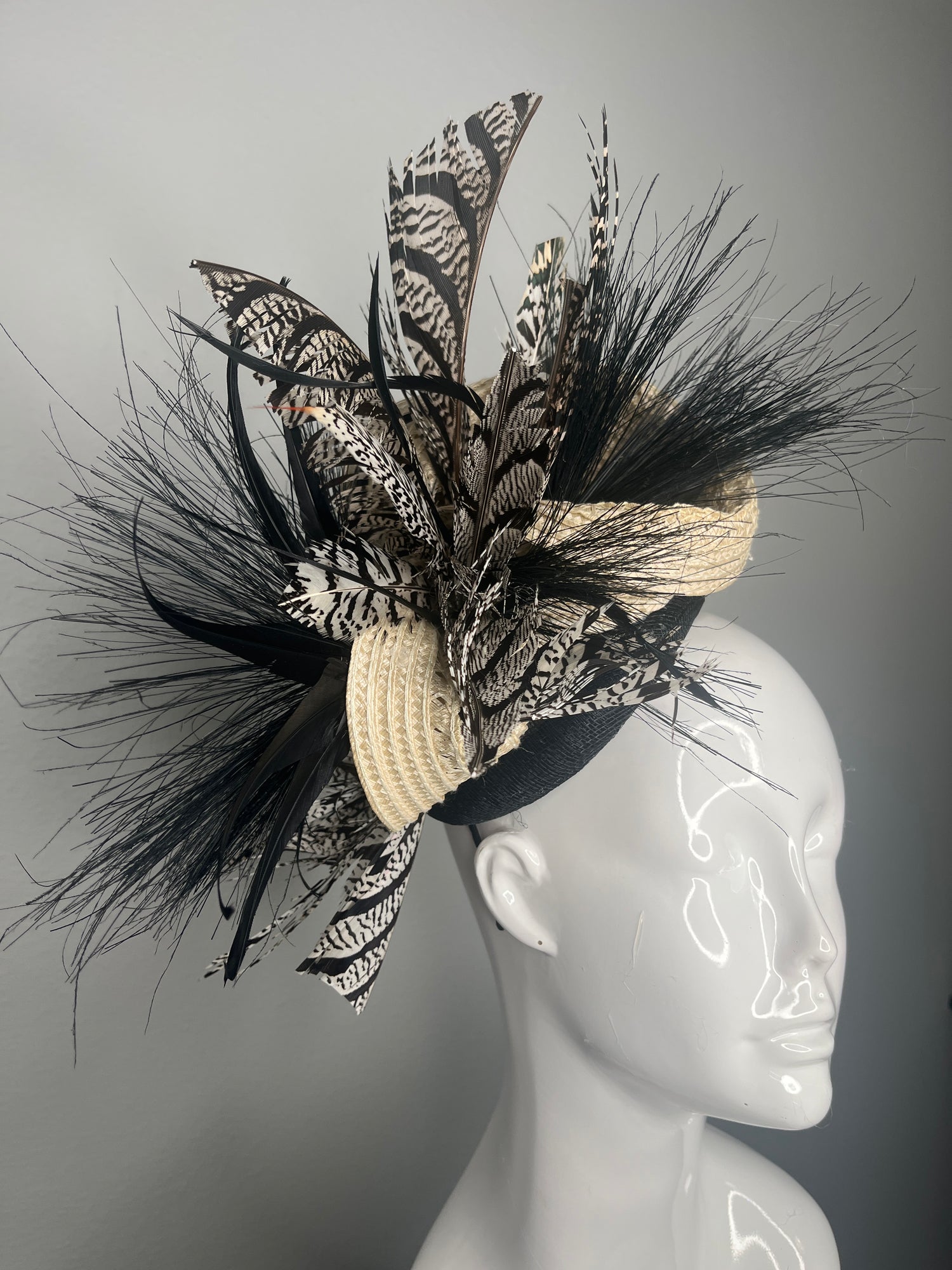 An arresting statement of contrast and texture, Noir Enchanté captures timeless elegance through its fusion of soft ivory straw and dramatic black plumage. Handcrafted with meticulous attention to detail, this couture fascinator showcases a sculpted straw curl accented by an opulent spray of patterned pheasant and coque feathers.