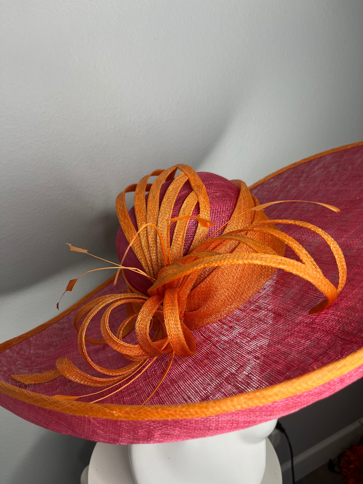Pink & Orange Wide-Brim Sinamay Fascinator with Sculpted Loops – Kentucky Derby Statement Hat
