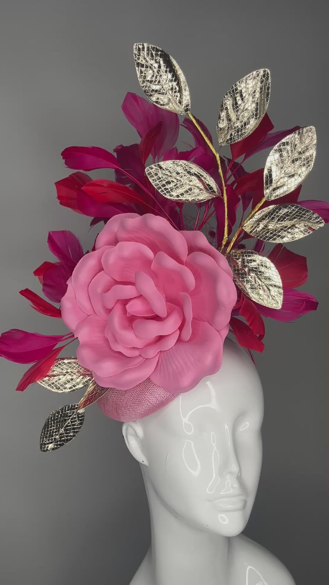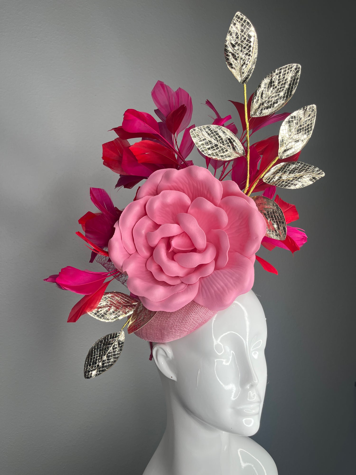 Make a striking entrance with this handcrafted couture fascinator featuring a sculpted blush pink rose, rich berry-toned feathers, and shimmering gold metallic leaf accents. Designed to create height, movement, and visual drama, this piece is both elegant and bold from every angle.