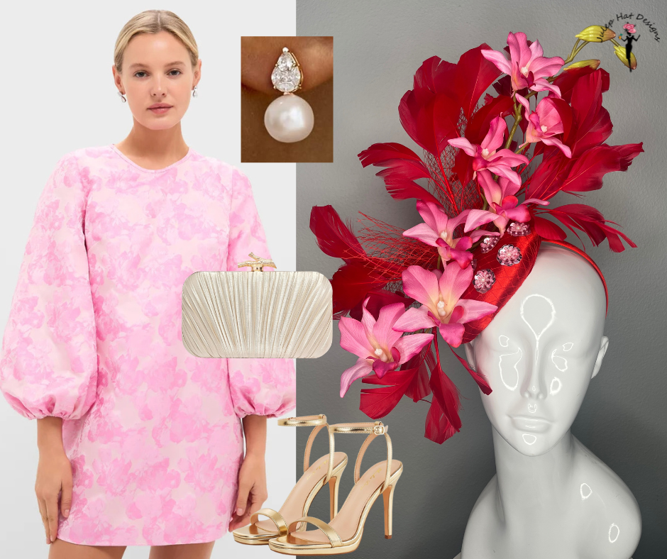 Make a bold entrance with this radiant fascinator featuring a striking mix of lush scarlet feathers and cascading pink orchids. Nestled atop a sculpted red sinamay base, the piece is finished with delicate veiling and sparkling crystal accents for just the right touch of glamour. Perfect for the Kentucky Derby, weddings, or any event where unforgettable style is a must.