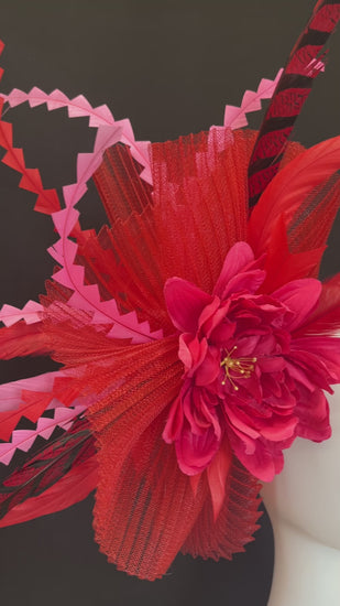 Experience elegance and sophistication with our Red and Pink Pheasant Feather Fascinator. Handcrafted with delicate feathers, this fascinator exudes a timeless charm. Perfect for weddings, races, or any special occasion. Elevate your style and make a statement with this beautiful accessory.