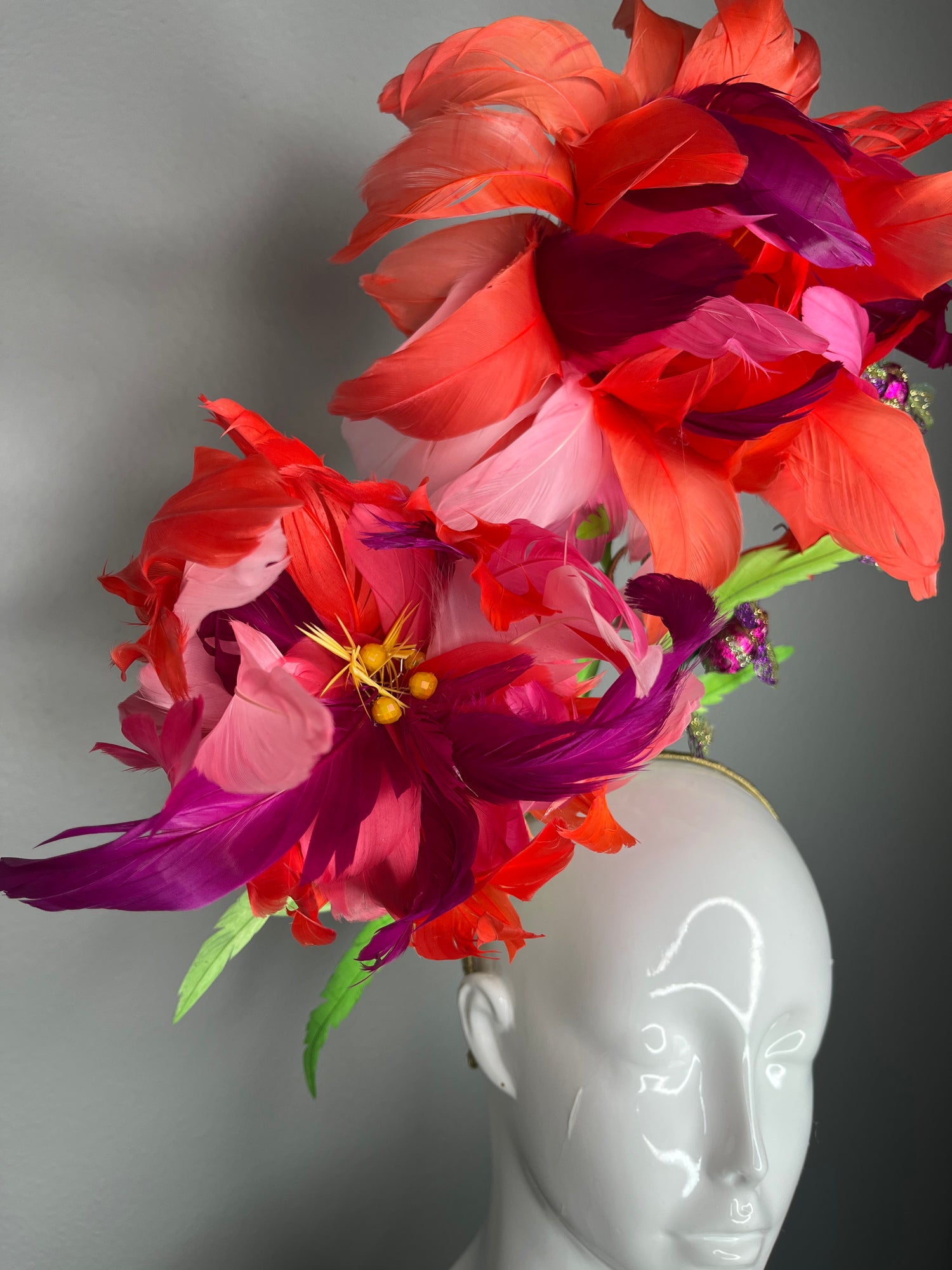 Step into the spotlight with this breathtaking couture floral fascinator, handcrafted by Julep Hat Designs for the woman who loves unforgettable race-day drama. This piece features two oversized feather flowers in vivid shades of coral, fuchsia, magenta, and blush pink, sculpted petal-by-petal for a lifelike, high-fashion bloom.