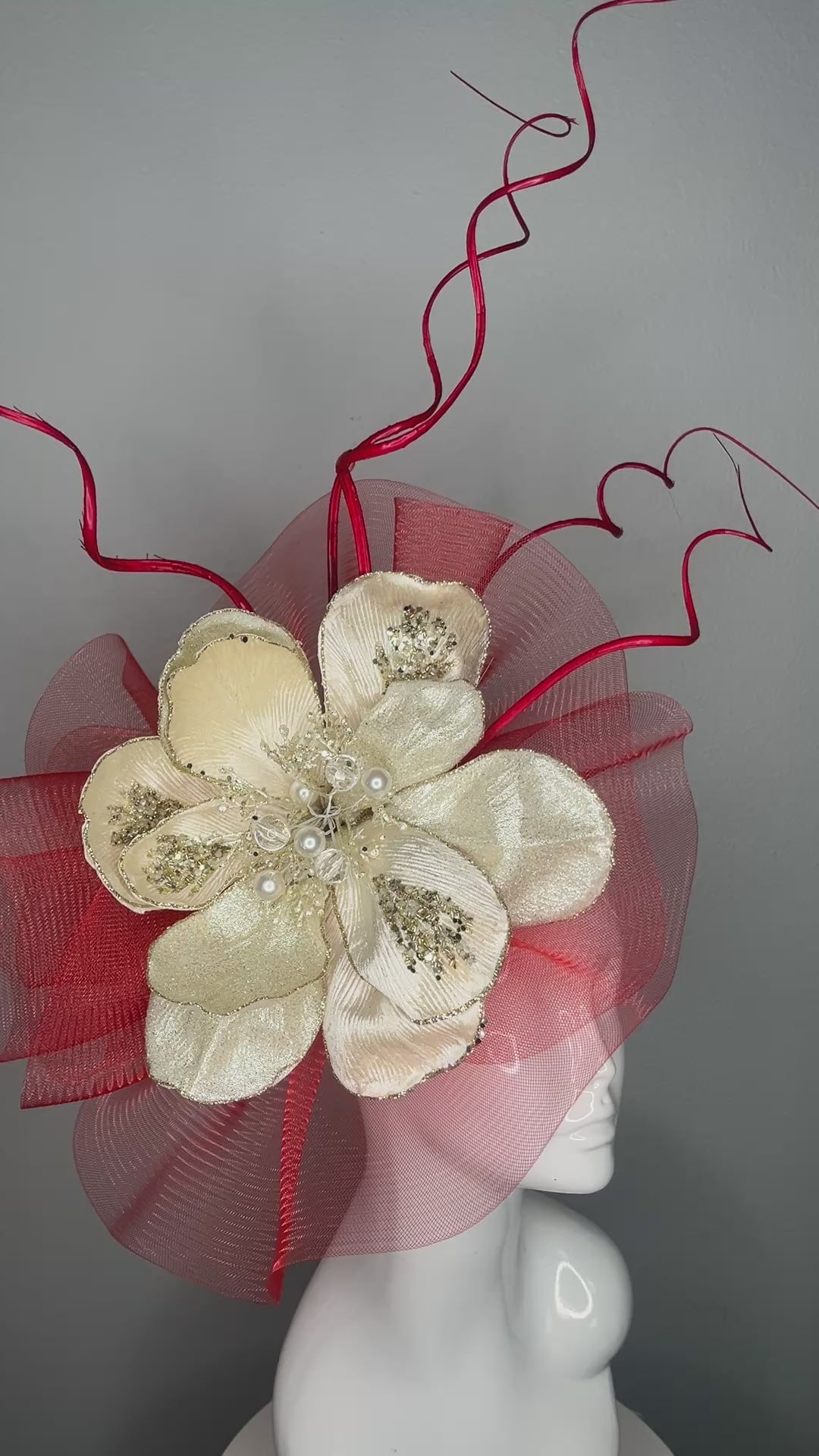 Make a striking entrance with this bold, one-of-a-kind fascinator, handcrafted in vivid red and ivory tones. A dramatic oversized ivory flower with pearl and crystal accents takes center stage, balanced by sculpted red sinamay ribbon and soaring, curled quills for added height and movement. Designed on a comfortable headband, this headpiece is lightweight yet show-stopping—perfect for the Kentucky Derby, Royal Ascot, or any event where standout style is a must.