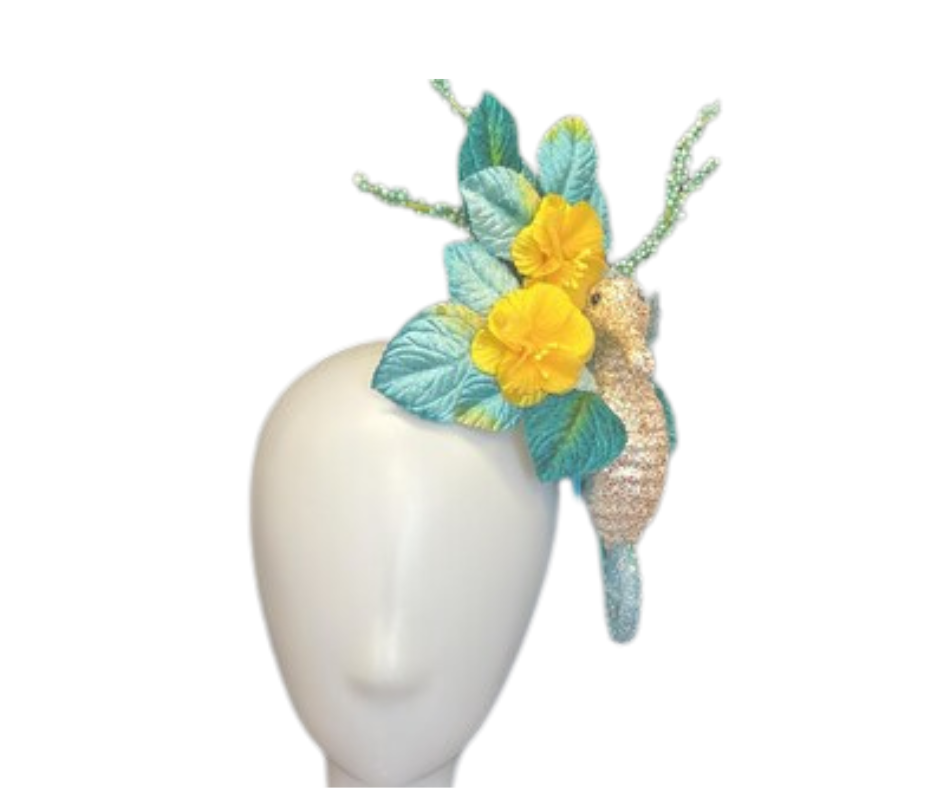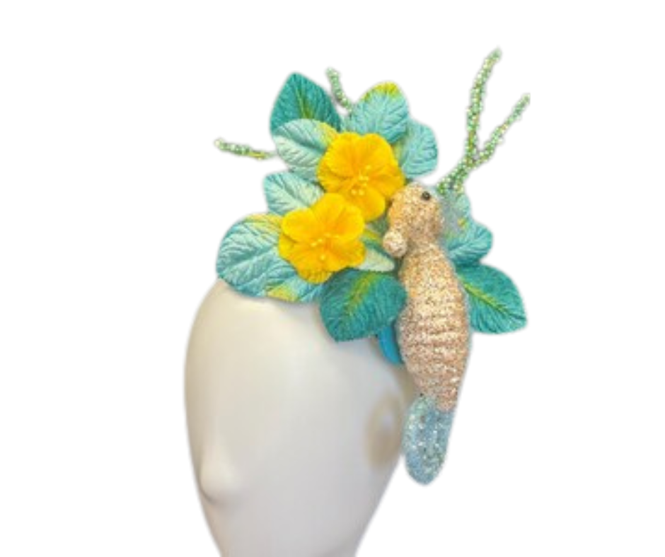 Elevate your look with our Teal and Yellow Seahorse Hair Clip Fascinator. This stylish accessory effortlessly adds a touch of elegance and whimsy, perfect for any occasion. The sturdy hair clip ensures a secure hold so you can confidently wear it all day.