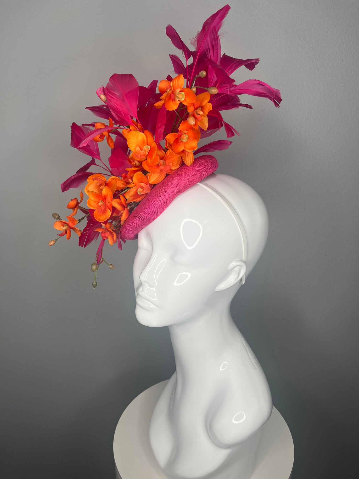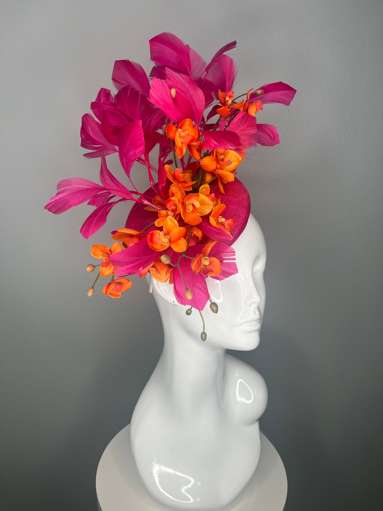 urn heads with “Tropical Tango,” a bold and fiery fascinator that brings high-energy glamour to any occasion. Set on a sculpted hot pink base, this piece bursts with bright orange orchids, berry-toned feathers, and dynamic movement that captures the spirit of a tropical getaway. Lightweight and easy to wear, it’s the perfect pop of color for the Kentucky Derby, destination weddings, or summer soirées. One-of-a-kind and unapologetically fabulous.